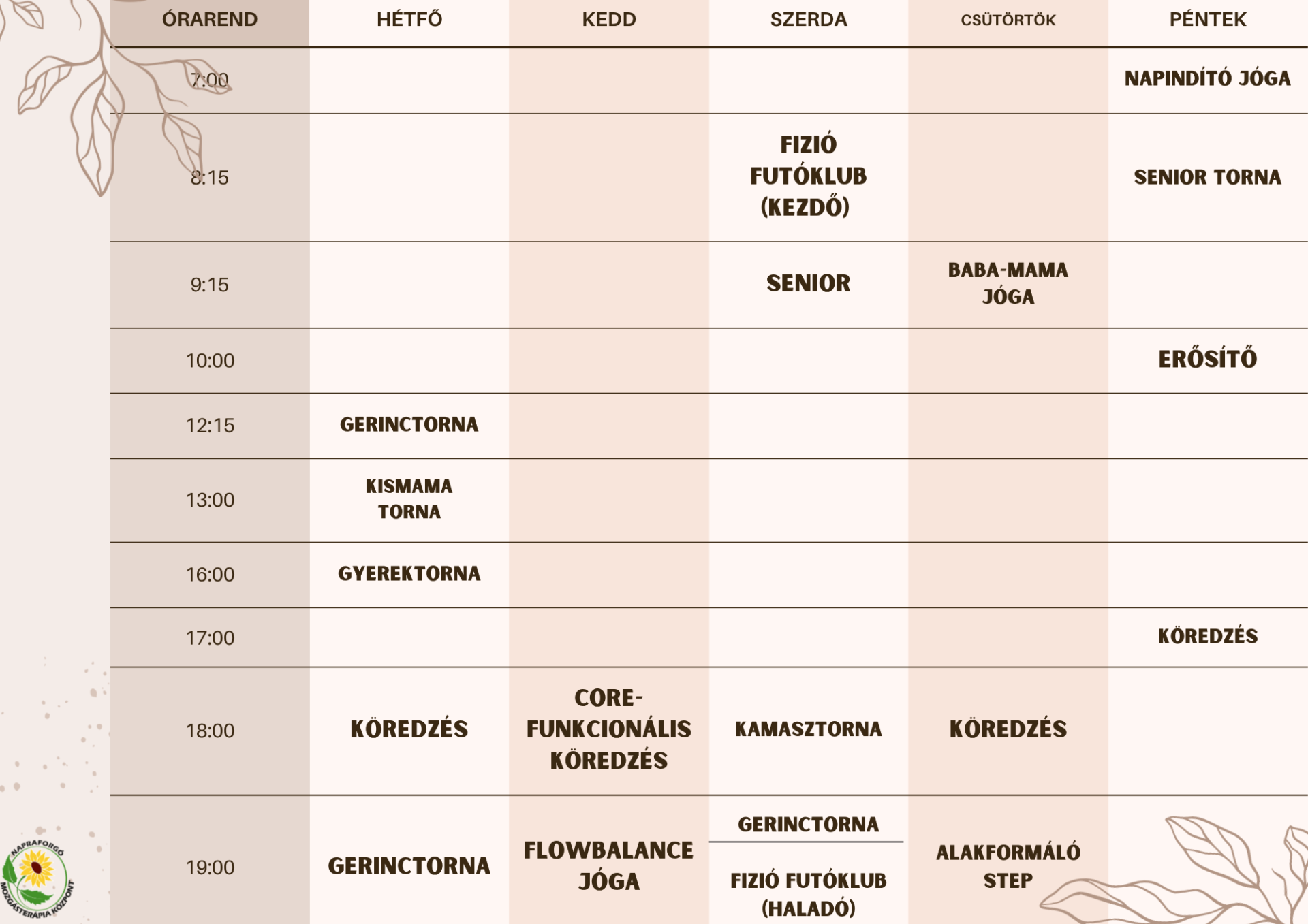 Fontos! Csoportos óráink nem gyógykezelések. Mozgásszervi panasz fennállása esetén egyéni gyógytorna-állapotfelmérést és személyre szabott kezelést javaslunk.